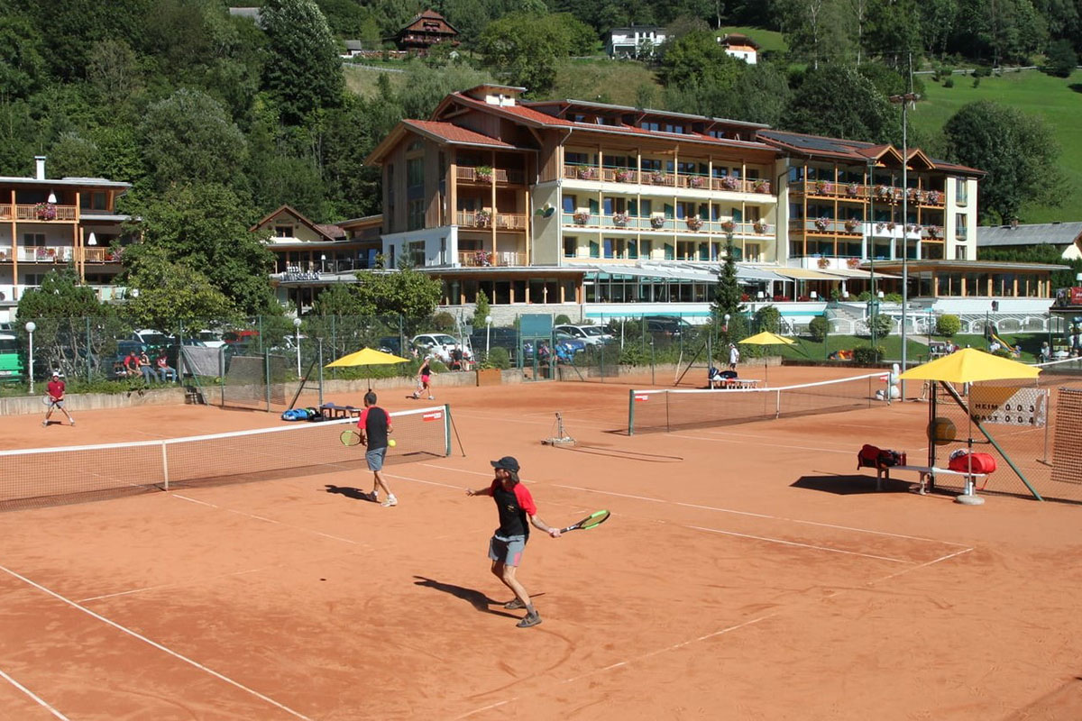 So starteten die ersten beiden Trainingsgruppen schon um 9 Uhr mit dem Training. Petar, unser Coach von der Sportschule Krainer übernahm das Warm-up. Danach ging es auf zwei Trainingsplätzen los. Petar und ich feilten mit den Camp-Teilnehmern an der Technik der Grundschläge, wobei das Erlernte anschließend gleich in verschiedenen Spielformen in die Praxis umgesetzt wurde. Um 10.30 Uhr kamen dann die beiden nächsten Trainingsgruppen. Bevor es nachmittags zur zweiten, einstündigen Trainingseinheit ging, konnten wir uns im Hotel am Buffet stärken. Hier bietet das Hotel einen wirklich tollen Service insbesondere mit den kostenlosen nicht-alkoholischen Getränken von der Saftbar, an der wir uns den ganzen Tag bedienen konnten.